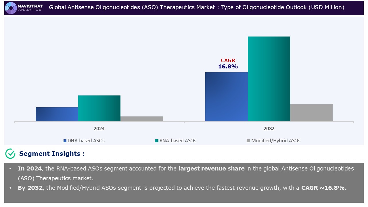 Based on the type of nucleotide, the Antisense Oligonucleotide (ASO) therapeutics market is segmented into DNA-based ASOs, RNA-based ASOs, and Modified/Hybrid ASOs.