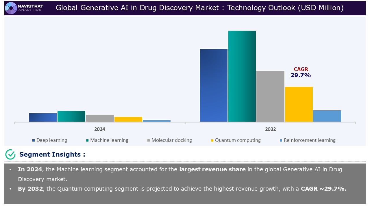 Based on the Technology, the global Generative AI in Drug Discovery market is segmented into Deep learning, Machine learning, Molecular docking, Quantum computing, and Reinforcement learning.