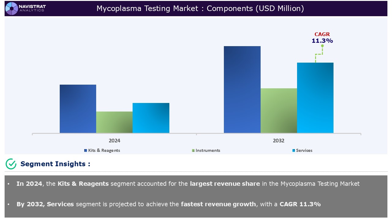 Based on the Component, the Mycoplasma Testing Market is segmented into Kits & Reagents, Instruments, and Services.