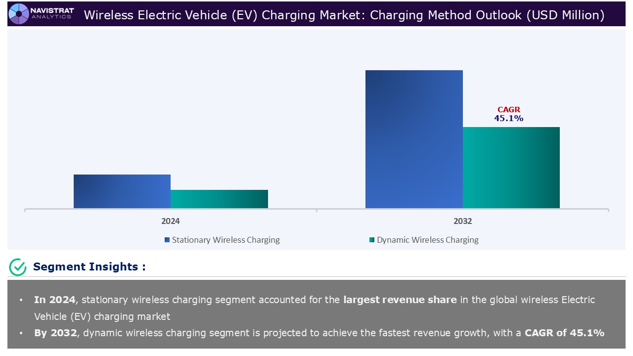 Based on the charging method, the wireless Electric Vehicle (EV) charging market is segmented into stationary wireless charging and dynamic wireless charging.